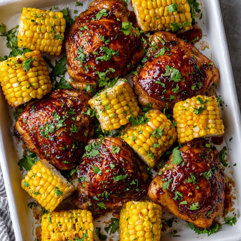 Save It There is nothing like a big tray of BBQ chicken and sweet corn to transport you right into summer. This easy one-pan recipe delivers juicy chicken with a sticky glaze and tender corn on the cob, all roasted to caramelized perfection. Cleanup is minimal, and the flavors capture everything that makes a sunny backyard meal so fun.
