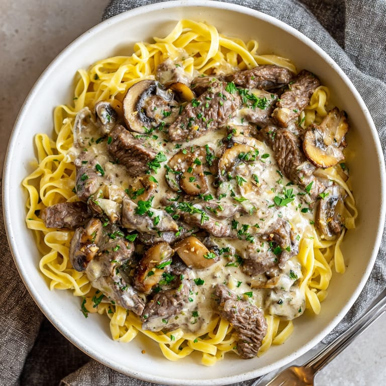 This stroganoff is traditionally served over wide egg noodles but it is fantastic over mashed potatoes or steamed rice too I like to add a crisp green salad or buttered peas alongside for a balanced plate For extra richness a sprinkle of fresh chives or dill on top makes every forkful aromatic