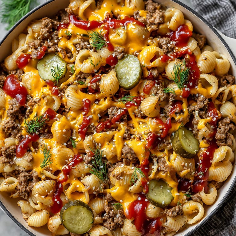 Save It Loaded cheeseburger pasta skillet is one of those weeknight wonders that hits every craving all in one pan an ultra comforting mashup of juicy ground beef cheesy sauce tangy pickles and pillowy pasta that captures the spirit of a classic burger but keeps things totally fuss free My family begs for this every time the weather cools off and I love how it brings everyone to the table fast