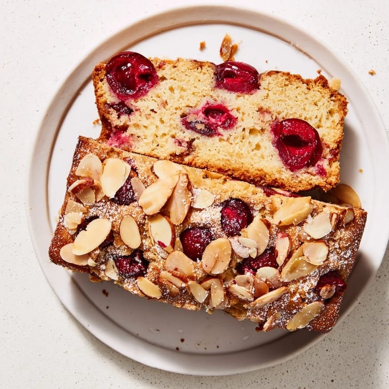 This cherry almond loaf cake is a delightful treat with simple ingredients and holiday charm.