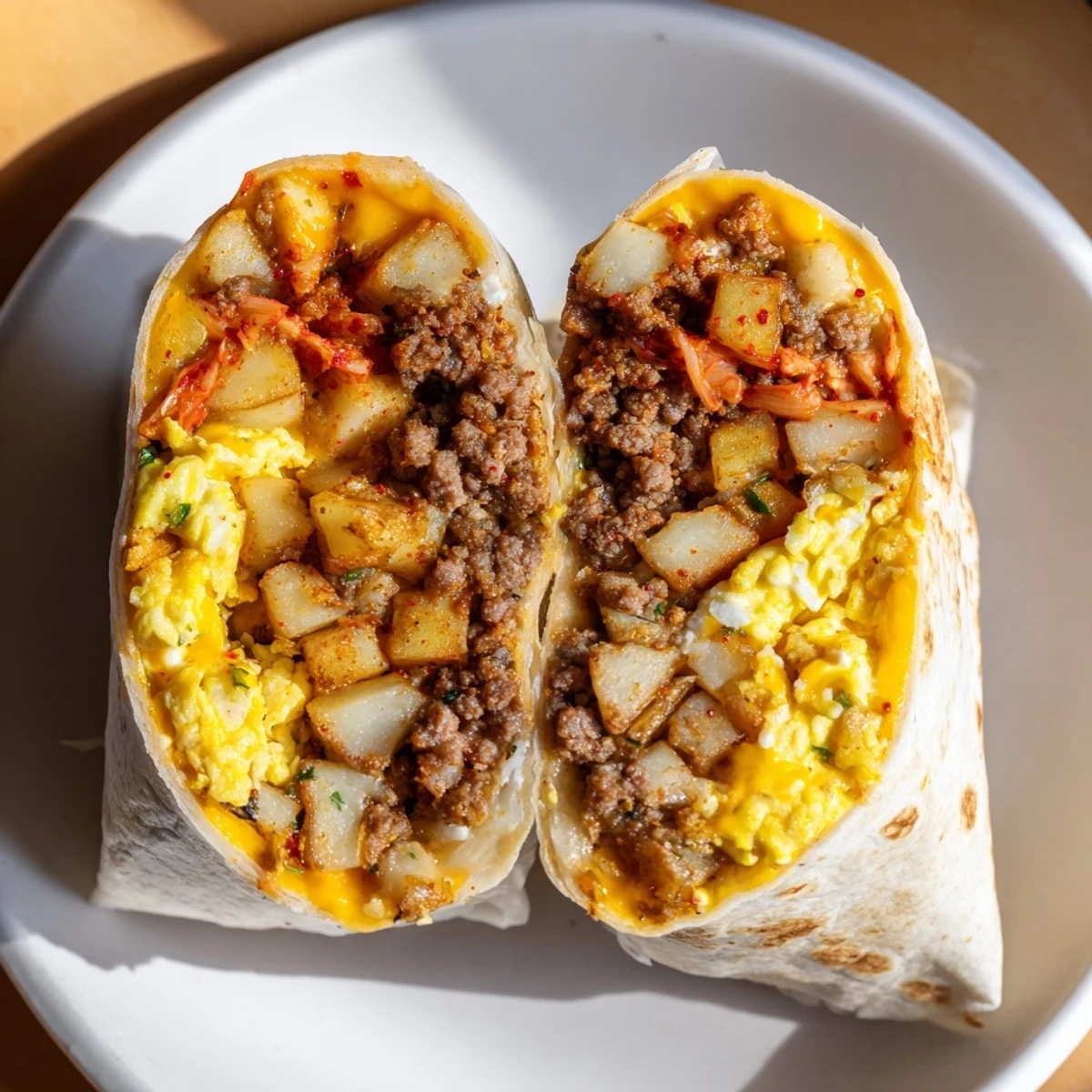 Save It A festive twist on classic breakfast burritos featuring scrambled eggs sausage roasted potatoes melty cheese and tangy kimchi for a vibrant holiday brunch.