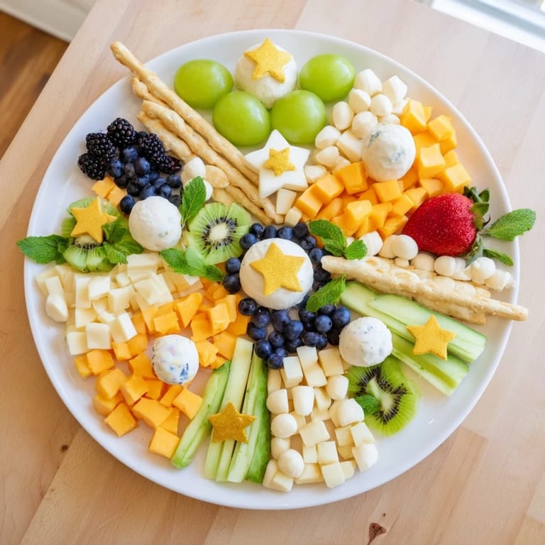 With no cooking needed, this recipe is quick but benefits from a sharp knife and steady hands to create neat slices and cubes. Use a large serving board or tray to give each element space so the cosmic design really stands out. Drain mozzarella well to prevent soggy spots and consider refrigerating ingredients before arranging so they hold their shape.