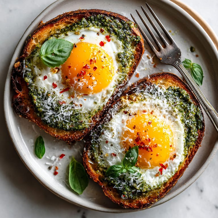 - Gently slide a spatula under each egg making sure to scoop up bits of crispy pesto Place each egg on a slice of toast Drizzle any extra pesto from the pan over the top for added flavor