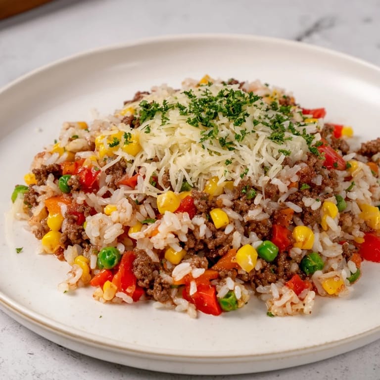 Save It A hearty, budget-friendly one-pan meal featuring ground beef or turkey, colorful vegetables, and fluffy rice cooked together for easy cleanup and maximum flavor.