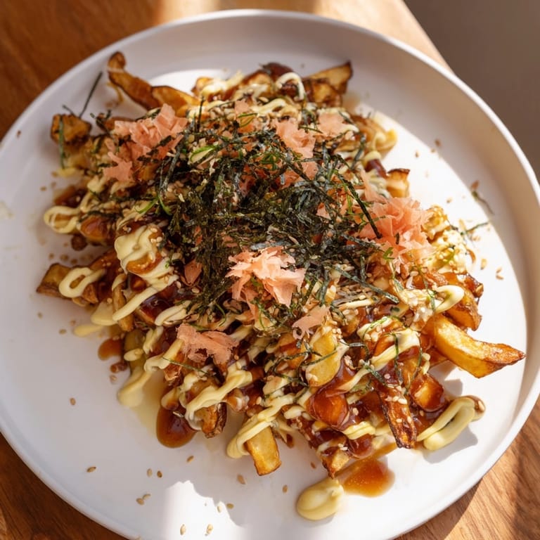 - Bonito flakes: smoky umami touch, waving beautifully atop hot fries
