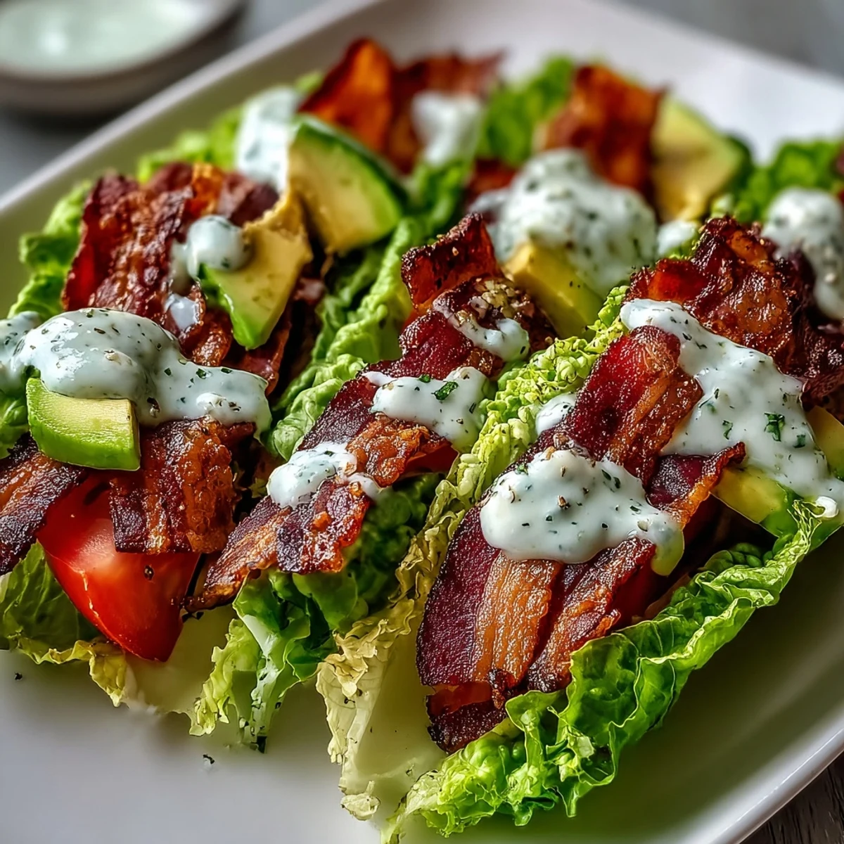 Save It A fresh, low-carb twist on the classic BLT, these crisp lettuce wraps are filled with smoky bacon, juicy tomatoes, creamy avocado, and a punchy garlic mayo, finished with plenty of cracked black pepper. This easy-to-make dish brings all the beloved flavors of a traditional sandwich into a light and refreshing format perfect for a quick lunch or dinner.