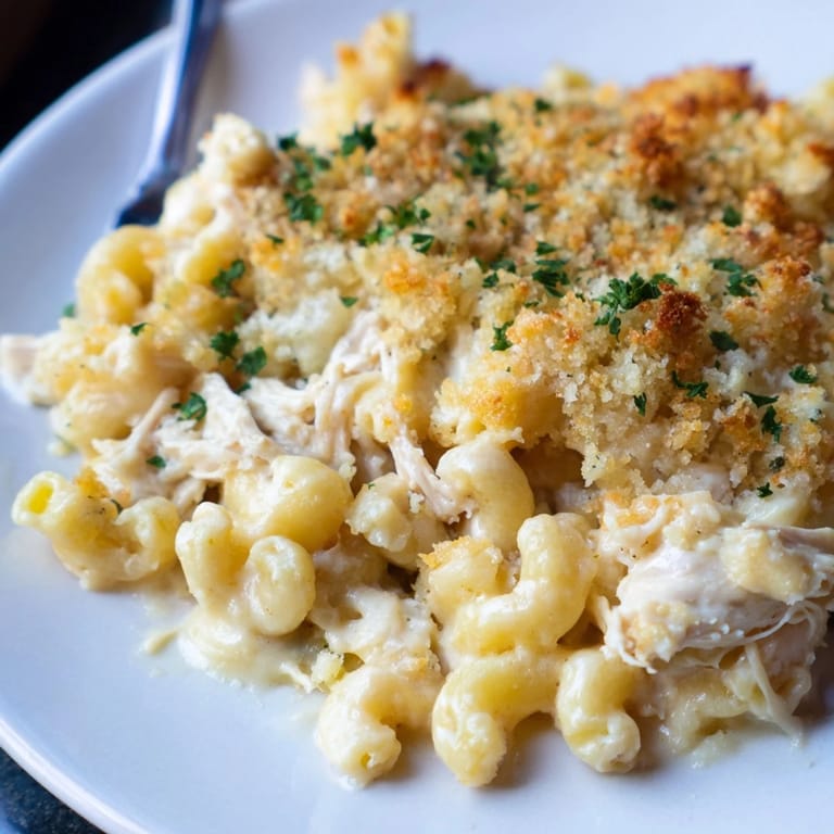 Save It A rich and comforting baked casserole combining creamy mac and cheese with tender chicken and a luscious Alfredo sauce, finished with a golden breadcrumb topping.