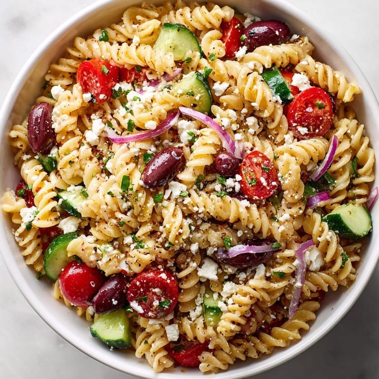 Save It Mediterranean pasta salad brings together bright flavors and crisp textures that wake up any table. This recipe is my lifesaver when I need something quick but impressive for picnics lunches or potlucks. It has just the right mix of tang savory crunch and freshness that everyone asks about.