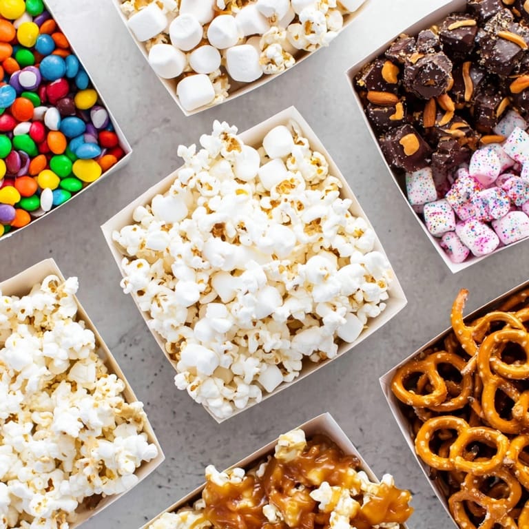 Fill boxes halfway with popcorn, then arrange sweet and savory treats in sections for a colorful and inviting presentation.