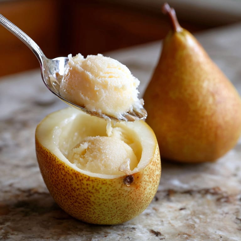 Store the filled pears in a sealed container to prevent freezer taste and ice buildup. If you have leftover sorbet place it in a smaller airtight container and freeze up to two weeks. Let the pears thaw for about five minutes at room temperature before serving to get that perfect creamy texture.
