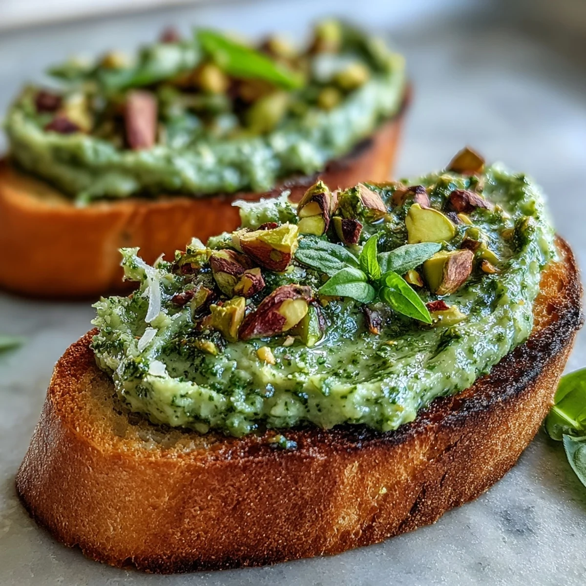 Pistachio pesto spread on crusty crostini, offering a delicious nutty and herby appetizer idea. Save It
