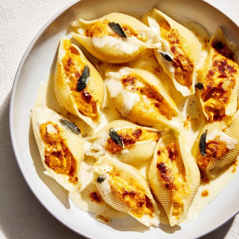 Save It Luxurious jumbo pasta shells filled with a creamy pumpkin and smoked Gouda blend, baked with a rich brown butter and sage Alfredo sauce. The ultimate autumn comfort dish for festive gatherings or cozy dinners.