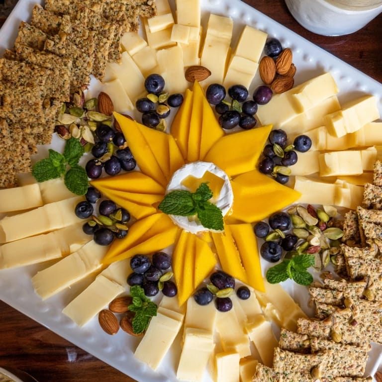 Arrange ingredients thoughtfully to balance colors and textures, making the shooting star shape clear and visually appealing. Use a star-shaped cookie cutter for mango and cheese pieces to enhance the theme. Drizzling honey near the brie adds a touch of sweetness and creates a delicious contrast.