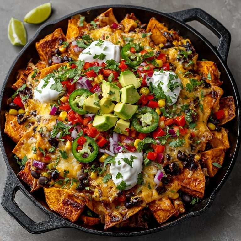 This vibrant Sweet Potato Nacho Skillet brings a wholesome upgrade to a Tex-Mex favorite. Roasted sweet potatoes form the hearty base, layered with smoky black beans, melty cheese, and all the fresh toppings you crave. It comes together in one pan for an easy weeknight meal that feels fun and comforting.