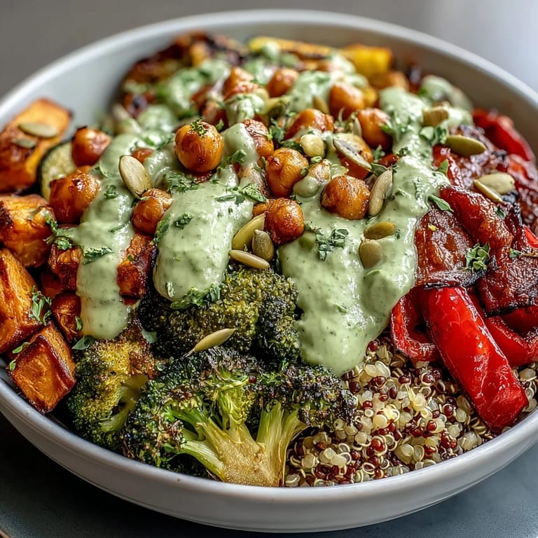 This bowl is more flexible than it looks, and that's exactly why it became a staple in my rotation. Swap the quinoa for brown rice or farro if that's what you have, or use whatever seasonal vegetables look best at your market—cauliflower, carrots, Brussels sprouts, parsnips, even mushrooms all work beautifully roasted. The framework stays the same: grains, roasted vegetables, protein from legumes, fresh toppings, and that incredible dressing.