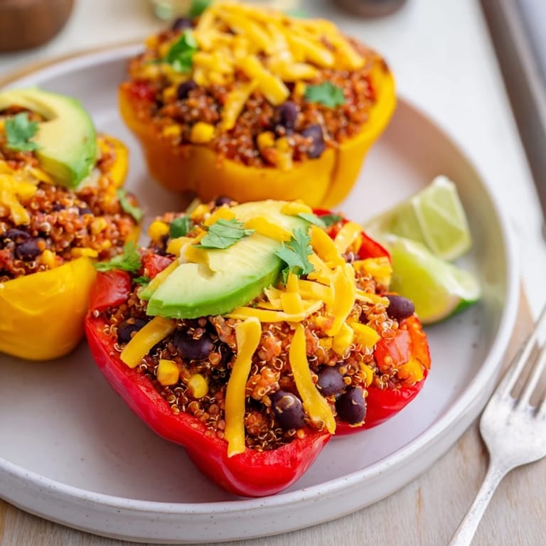 Save It Colorful bell peppers filled with a savory blend of black beans, quinoa, vegetables, and spices, baked to perfection for a wholesome, satisfying meal.