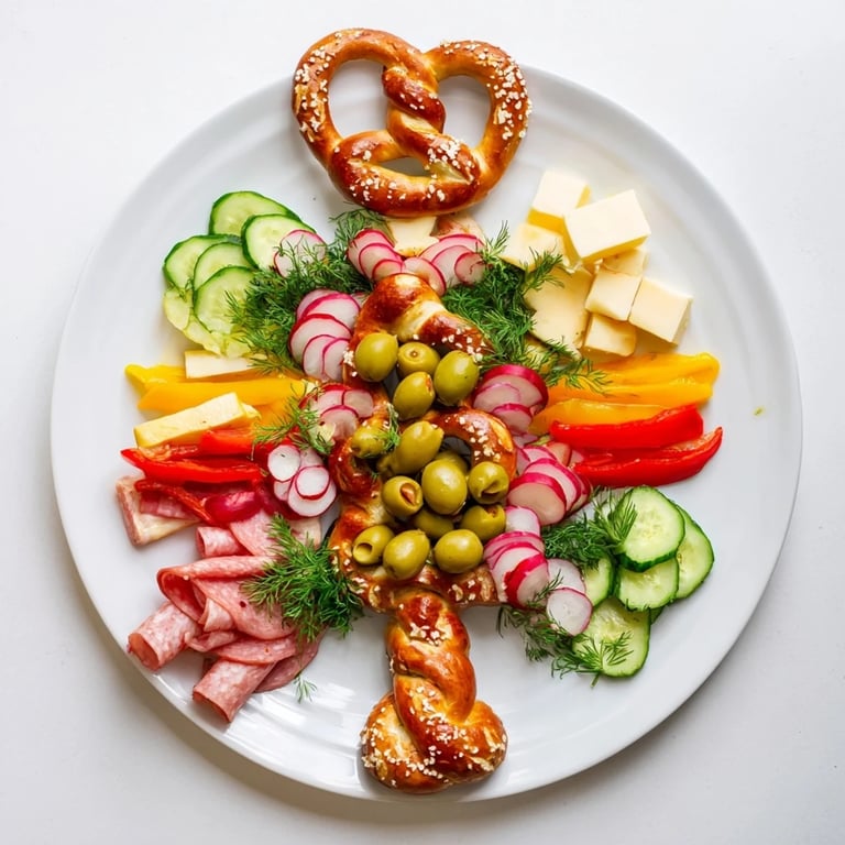 - Artfully arrange cheese, cured meats (if using), vegetables, olives, and radishes among and around the pretzels to create a lush, colorful tree effect. Garnish with fresh herbs.