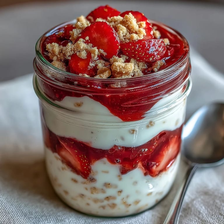 - In the morning, give it a gentle stir to distribute everything evenly, then top with graham cracker crumbs and fresh strawberry slices if you want that cheesecake moment front and center. Eat it cold straight from the jar—no heating required.