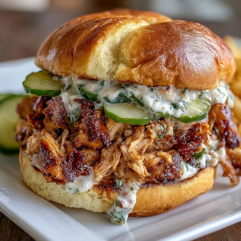 - Pile the warm shredded chicken generously onto your buns, then crown each sandwich with a handful of crisp dill pickle slices—the cold pickles against the warm, steamy chicken are what make this sing. Serve immediately while everything's still warm and the contrast is at its peak.