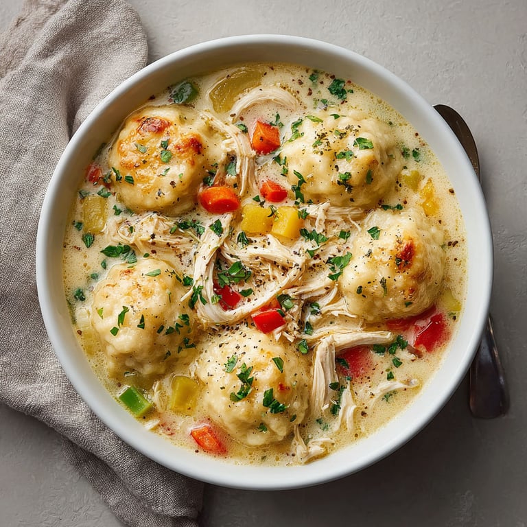 Shredded chicken and fluffy dumplings simmered in a creamy, hearty broth for the ultimate cozy comfort.