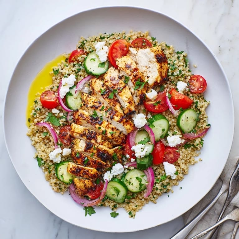 Save It A vibrant, protein-packed salad featuring juicy lemon-Dijon marinated chicken atop fluffy quinoa, tossed with crisp vegetables and a zesty dressing.