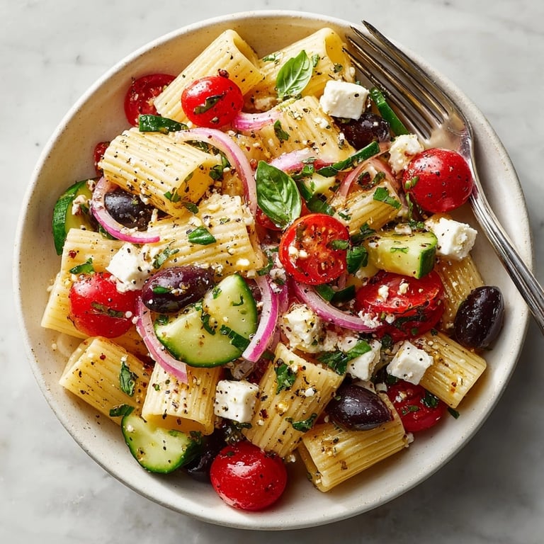 This vibrant Mediterranean pasta brings together al dente noodles, briny olives, crisp vegetables, and creamy feta for a refreshing dish that’s as perfect for outdoor picnics as it is for weeknight dinners. Tossed with a zesty dressing and fresh herbs, the flavors meld to offer a bright, tangy, and savory bite. Perfect served chilled or at room temperature, it pairs deliciously with grilled meats or as a satisfying standalone meal.