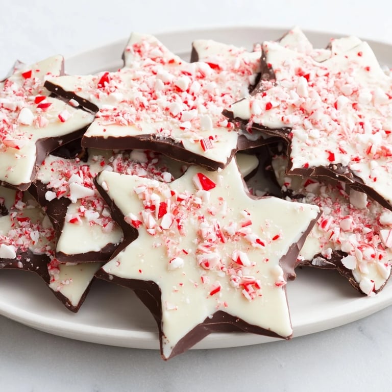 A festive, minty-sweet treat featuring layers of rich chocolate and creamy white chocolate, topped with crunchy peppermint candy, shaped into charming snowflakes—perfect for holiday gifting or parties.